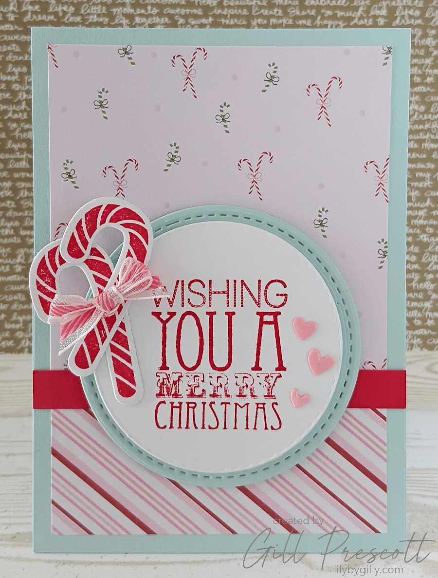 Full of soft, pretty patterns, including one covered in tiny candy canes, it practically made the design decision for me. I paired it with a co-ordinating candy stripe and let the papers do most of the talking… with a few fun extras along the way.