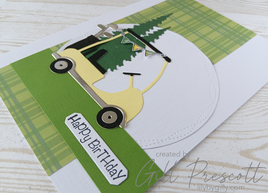 To create a little background detail, I die cut two trees in Garden Green cardstock using one of my Christmas die sets – I love getting more use out of my dies! One tree was trimmed slightly shorter, then layered over the other for extra depth. These were adhered to the left-hand side of the circle die cut, with the golf cart layered in front.