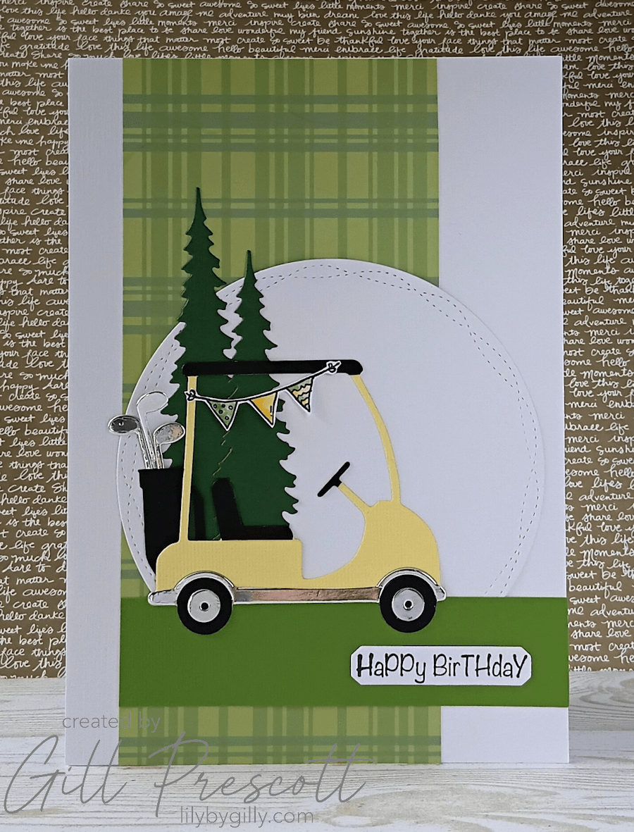 The mix of tartan paper, greenery, and the bright yellow golf cart gives this card a fun, outdoorsy feel that is perfect for a golf lover. The scene is simple but full of personality, and the bunting adds just the right amount of birthday celebration. The overall design keeps a masculine feel with the tartan paper, simple layout, and bold golf cart focal point, making it ideal for a male birthday card.