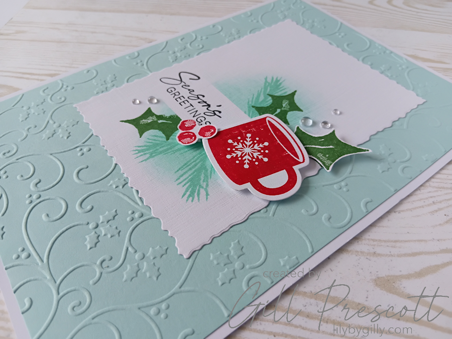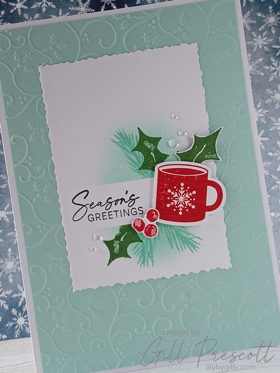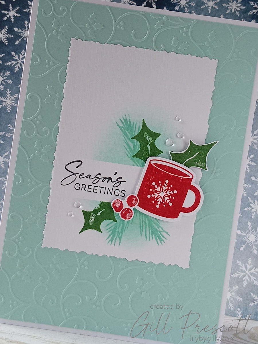 This week’s theme challenge over at 52 Christmas Card Throwdown is all about mugs, which immediately made me think of cosy festive drinks, warm colours, and a touch of festive foliage. I decided to revisit one of my favourite colour combinations — Pool Party, Real Red and white — and added a little Garden Green for the holly. The result is a fresh but festive card with a lovely mix of texture, stamping and layering. Here’s how it came together.
